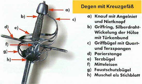 | Parierelemente | Alle Gefäßbestandteile, die der Abwehr der gegnerischen Klinge und zumindest teilweise auch als Handschutz dienen. |