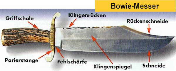 Bowie-Messer Bild | Schweres amerikanisches Kampfmesser, mit konkavem Verlauf des Messerrückens vom vorderen Drittel bis zur Spitze, benennt nach Colonel James Bowie, der 1836 in der Schlacht von Almao, Texas, fiel. |